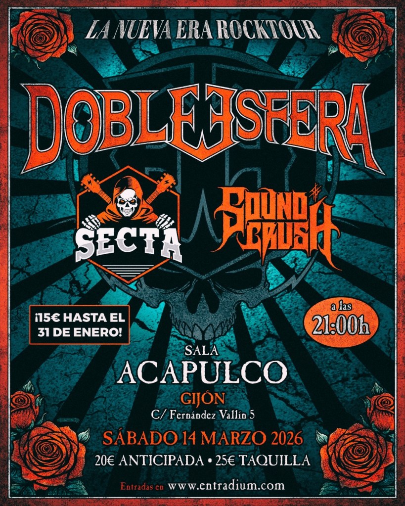 El sábado 14 de marzo vamos a vivir una noche inolvidable de Hard Rock y Metal en Gijón. Doble Esfera presenta su reconocido álbum La Nueva Era del Rock, acompañados de dos grupos que están dando de qué hablar en la escena asturiana: Secta y Soundcrush. Será en uno de los templos de la noche gijonesa, la sala Acapulco. Secta es una banda de Avilés que facturan un hard rock al más puro estilo AC/DC, Airbourne y Motörhead, que vienen presentando su disco «Panzer», mientras que Soundcrush es un grupo de Groove metal con un sonido pesado y directo que combina riffs afilados, bases rítmicas demoledoras y atmósferas modernas, que estarán presentando “The Hunt”.